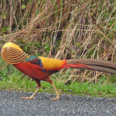 Legend has it that Goldie (a domestic golden pheasant) found his way on to the Karamea Bluff a few years ago, and actually survived the wild living there for some years, and to this day it is not certain that he is not still there. At various times Goldie was joined by female pheasants, but they did not survive there for long, or they didn't like it... for whatever reason they disappeared from view very quickly. But Goldie persisted, he did pretty well living the bush life and was seen quite a few times over the years, often many months apart.... on the last sighting Goldie was feeling little amorous and was targeting a young female Weka with all of his best attentions!