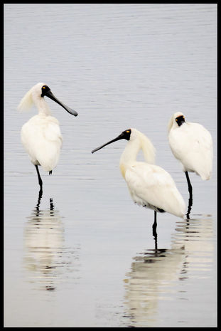 Small groups of spoonbills hang out inland on farmland and often out in the estuary and river mouth regions. I have seen them most often during wet weather periods or just after, particularly they seem to be more active in the winter. They are here in the summer, but they are fairly inactive and spend the bulk of the day hidden away, asleep, Groups that you see out and about may vary from 3 to 30. You are more likely to see them out and about at low tide where they can feed on the crabs and crawlies, but you may also see them around in the paddocks, particularly if it has been wet. It is always a thrill to see them.
